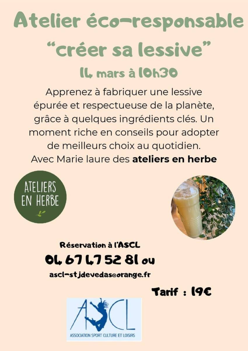 L’ASCL organise un atelier "créer sa lessive" le 14 mars 2026 à 10h30.
