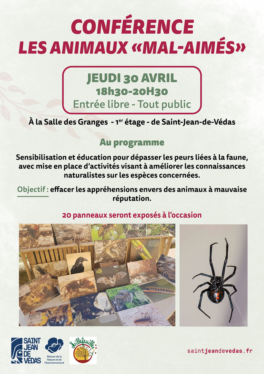 Sensibilisation et éducation pour dépasser les peurs liées à la faune, avec mise en place d’activités visant à améliorer les connaissances naturalistes sur les espèces concernées. Objectif : effacer les appréhensions envers des animaux à mauvaise réputation. Vingt panneaux seront exposés à l’occasion.