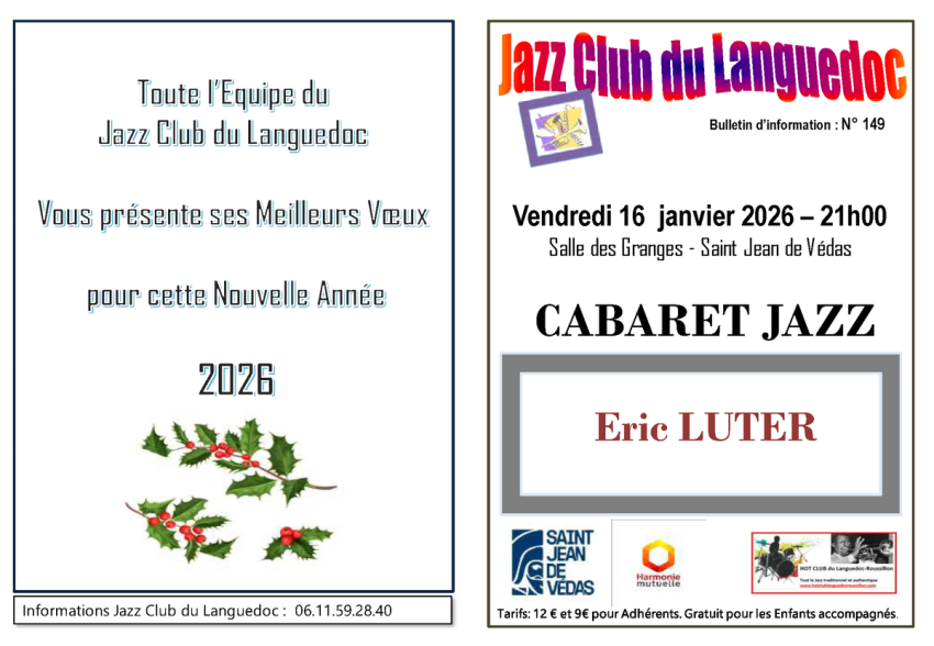 Soirée cabaret jazz, organisée par le Jazz Club du Languedoc à la Salle des Granges le vendredi 16 janvier à 21h.