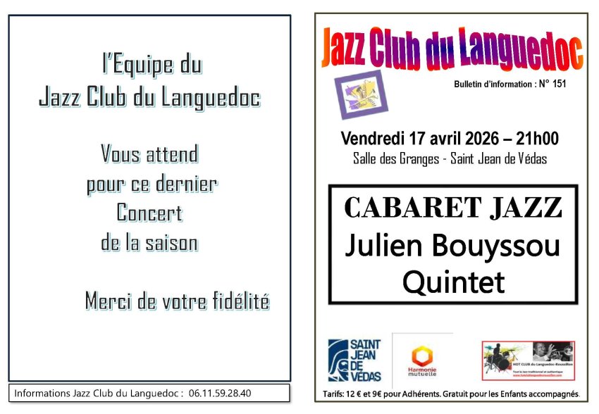 L'équipe du Jazz Club du Languedoc vous donne rendez-vous le 17 avril 2026 à 21h.